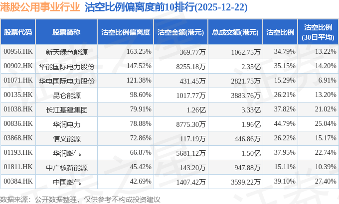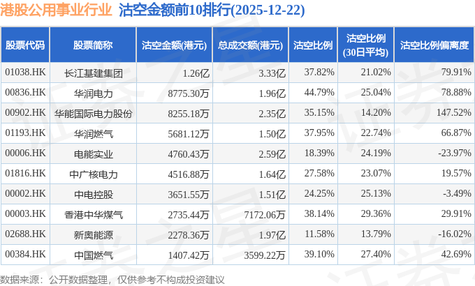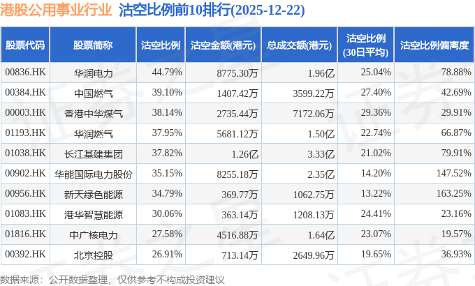 从沽空比例来看,华润电力、中国燃气、香港中华煤气沽空比例位居行业前三,分别为44.79%、39.1%、38.14%。