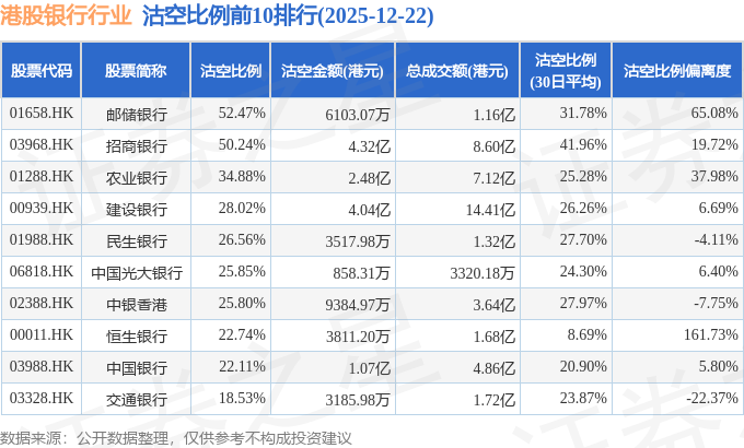 从沽空比例来看,邮储银行、招商银行、农业银行沽空比例位居行业前三,分别为52.47%、50.24%、34.88%。