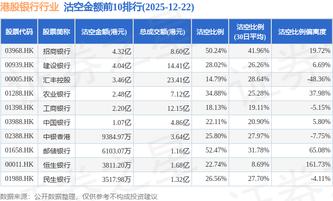由于港股人民币柜台交易股票成交金额较小,沽空比例普遍偏高,为了避免干扰,已将人民币柜台交易股票从排行表格中剔除。