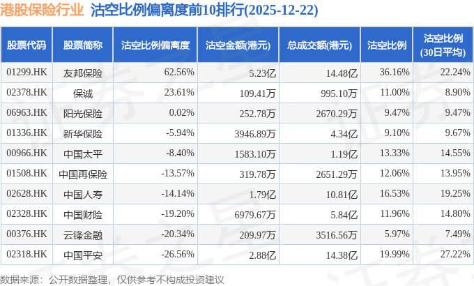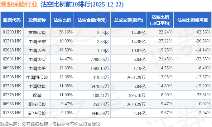 从沽空比例来看,友邦保险、中国平安、中国人寿沽空比例位居行业前三,分别为36.16%、19.99%、16.53%。