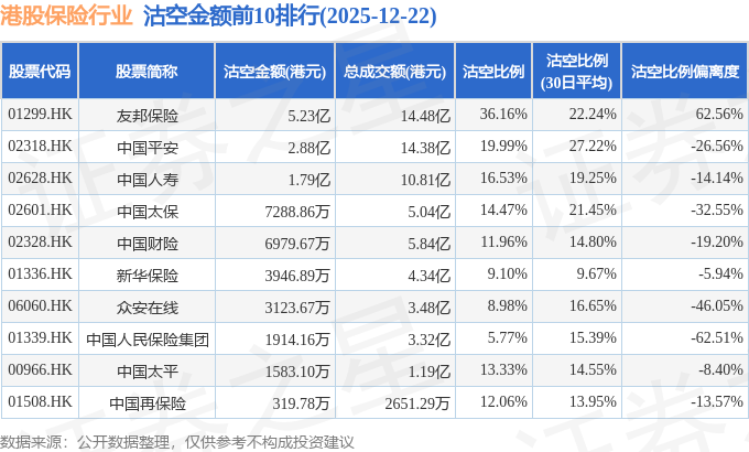 从沽空金额来看,友邦保险、中国平安、中国人寿沽空金额位居行业前三,分别为5.23亿港元、2.88亿港元、1.79亿港元。