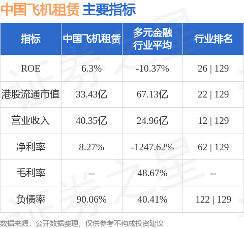 中国飞机租赁港股市值33.43亿港元,在多元金融行业中排名第22。主要指标见下表: