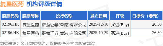 投行对该股的评级以买进(Buy)为主,近90天内共有2家投行给出买进(Buy)评级,近90天的目标均价为26.5港元。群益证券(香港)有限公司最新一份研报给予复星医药买进(Buy)评级,目标价26.5港元。