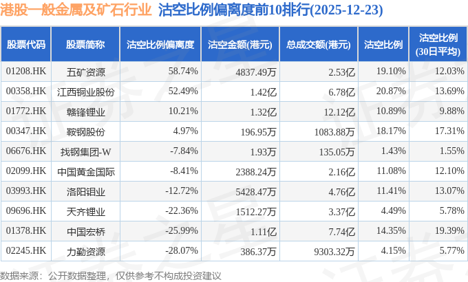 从沽空比例偏离度来看,五矿资源、江西铜业股份、赣锋锂业沽空比例偏离度位居行业前三,分别为58.74%、52.49%、10.21%。