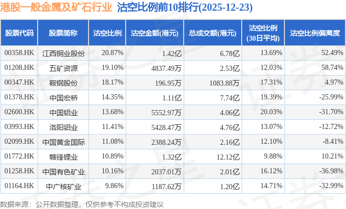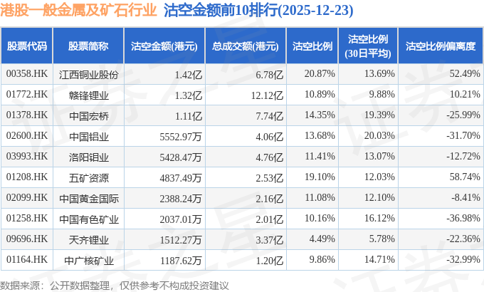 从沽空金额来看,江西铜业股份、赣锋锂业、中国宏桥沽空金额位居行业前三,分别为1.42亿港元、1.32亿港元、1.11亿港元。