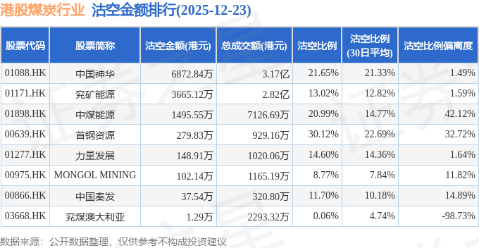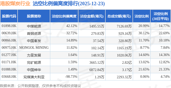 从沽空比例来看,首钢资源、中国神华、中煤能源沽空比例位居行业前三,分别为30.12%、21.65%、20.99%。