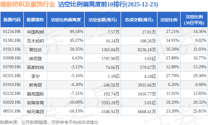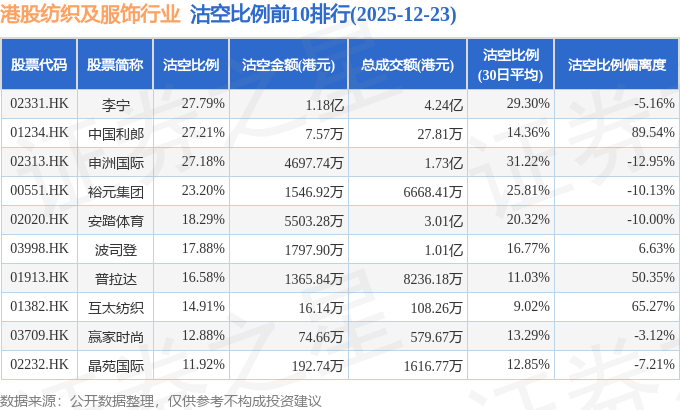 从沽空比例来看,李宁、中国利郎、申洲国际沽空比例位居行业前三,分别为27.79%、27.21%、27.18%。