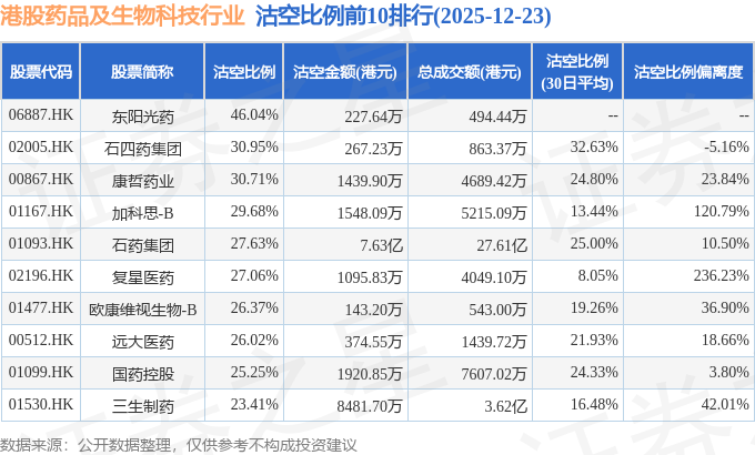 从沽空金额来看,石药集团、信达生物、三生制药沽空金额位居行业前三,分别为7.63亿港元、9382.75万港元、8481.7万港元。