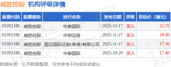 投行对该股的评级以买入为主,近90天内共有4家投行给出买入评级,近90天的目标均价为18.63港元。中泰国际最新一份研报给予威胜控股买入评级,目标价21.75港元。