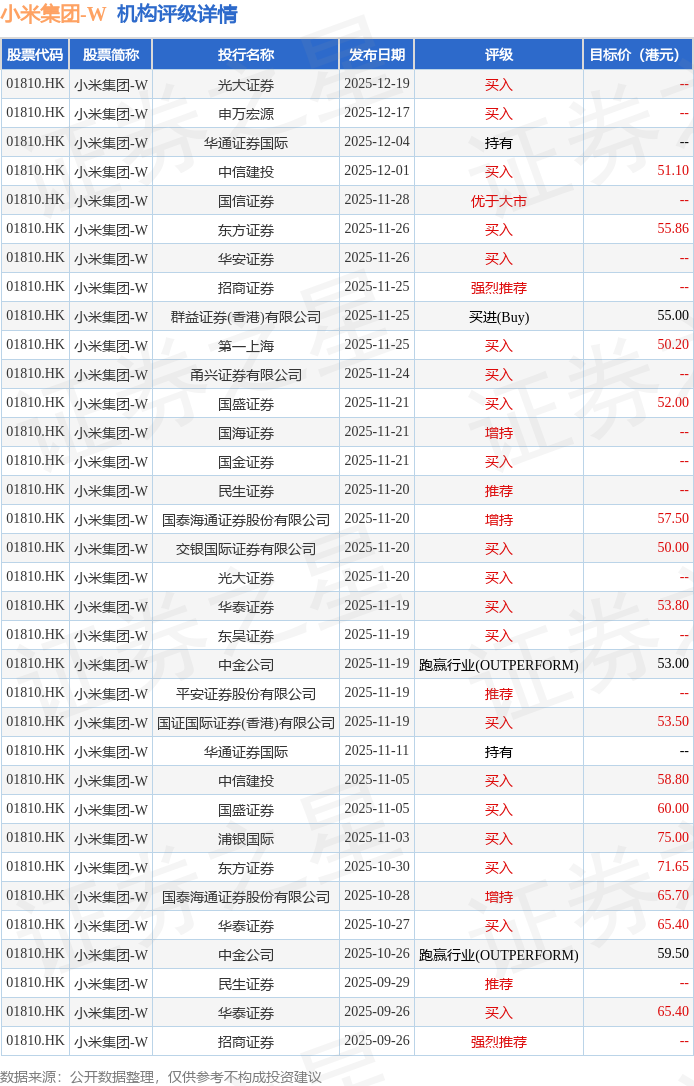 投行对该股的评级以买入为主,近90天内共有20家投行给出买入评级,近90天的目标均价为58.52港元。光大证券最新一份研报给予小米集团-W买入评级。