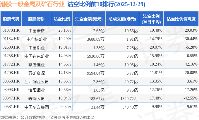 从沽空比例来看,中国宏桥、中广核矿业、中国铝业沽空比例位居行业前三,分别为25.13%、19.29%、19.01%。