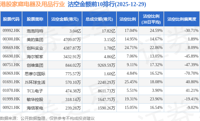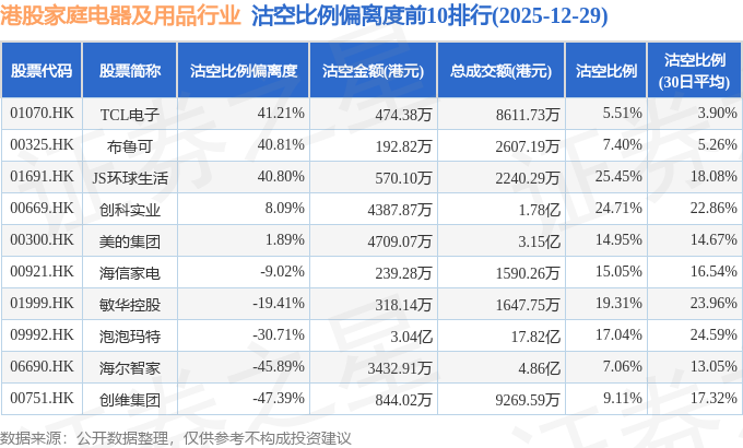 从沽空比例来看,JS环球生活、创科实业、敏华控股沽空比例位居行业前三,分别为25.45%、24.71%、19.31%。