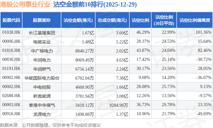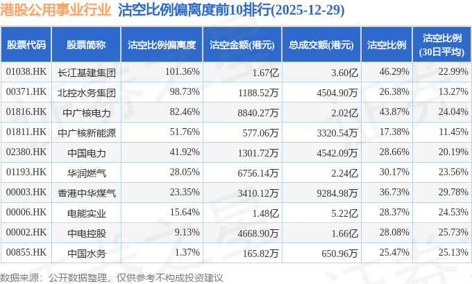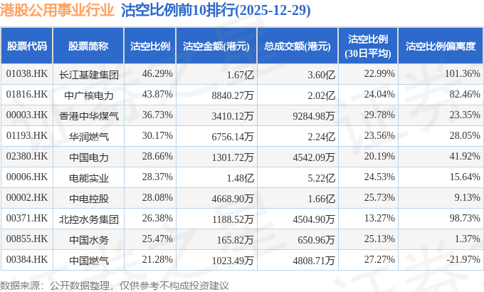 从沽空比例来看,长江基建集团、中广核电力、香港中华煤气沽空比例位居行业前三,分别为46.29%、43.87%、36.73%。