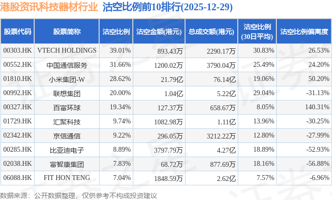 从沽空比例来看,VTECH HOLDINGS、中国通信服务、小米集团-W沽空比例位居行业前三,分别为39.01%、31.66%、28.62%。