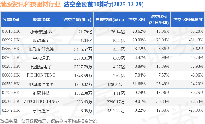 从沽空金额来看,小米集团-W、联想集团、长飞光纤光缆沽空金额位居行业前三,分别为21.79亿港元、1.04亿港元、5406.57万港元。