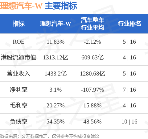 理想汽车-W港股市值1313.12亿港元,在汽车整车行业中排名第4。主要指标见下表: