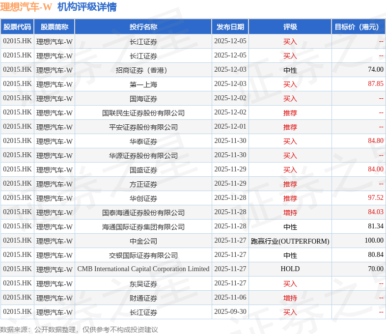截至2025年12月29日收盘,理想汽车-W(02015.HK)报收于66.1港元,上涨1.61%,成交量1494.89万股,成交额10.02亿港元。投行对该股的评级以买入为主,近90天内共有9家投行给出买入评级,近90天的目标均价为84.44港元。长江证券最新一份研报给予理想汽车-W买入评级。
