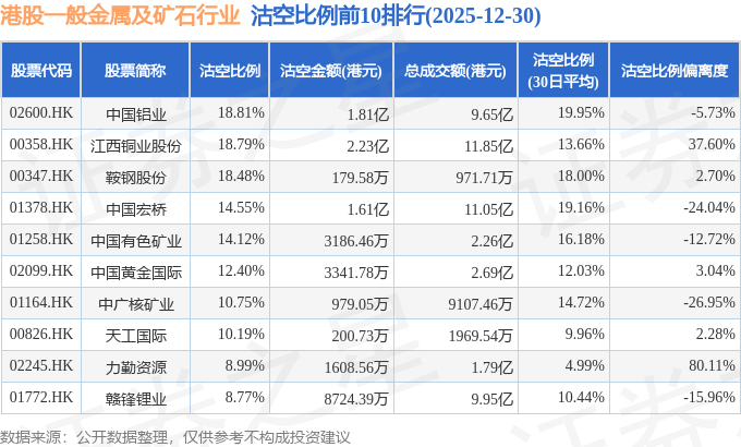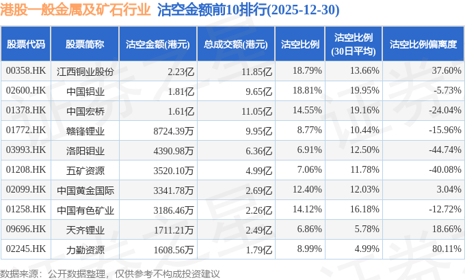 从沽空比例偏离度来看,找钢集团-W、力勤资源、江西铜业股份沽空比例偏离度位居行业前三,分别为91.62%、80.11%、37.6%。