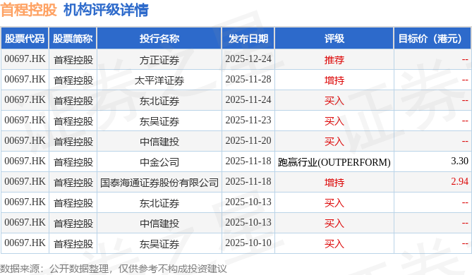 截至2026年1月2日收盘,首程控股(00697.HK)报收于2.18港元,上涨2.83%,成交量2477.8万股,成交额5376.53万港元。投行对该股的评级以买入为主,近90天内共有6家投行给出买入评级,近90天的目标均价为3.12港元。方正证券最新一份研报给予首程控股推荐评级。
