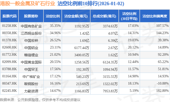 从沽空比例偏离度来看,找钢集团-W、力勤资源、江西铜业股份沽空比例偏离度位居行业前三,分别为237.41%、182.8%、144.23%。