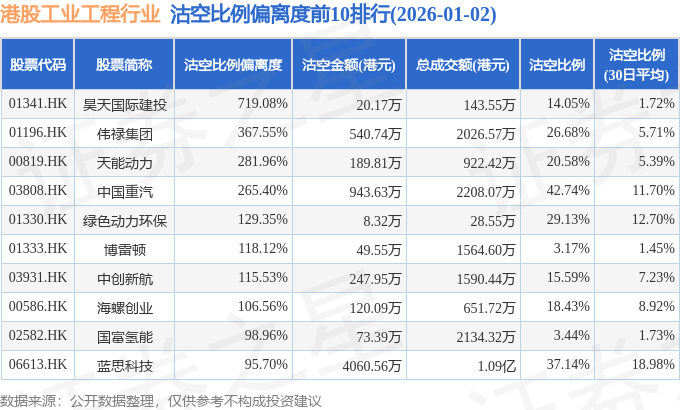 从沽空比例偏离度来看,昊天国际建投、伟禄集团、天能动力沽空比例偏离度位居行业前三,分别为719.08%、367.55%、281.96%。