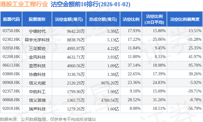 从沽空金额来看,宁德时代、舜宇光学科技、三花智控沽空金额位居行业前三,分别为9642.2万港元、8838.76万港元、4995.97万港元。
