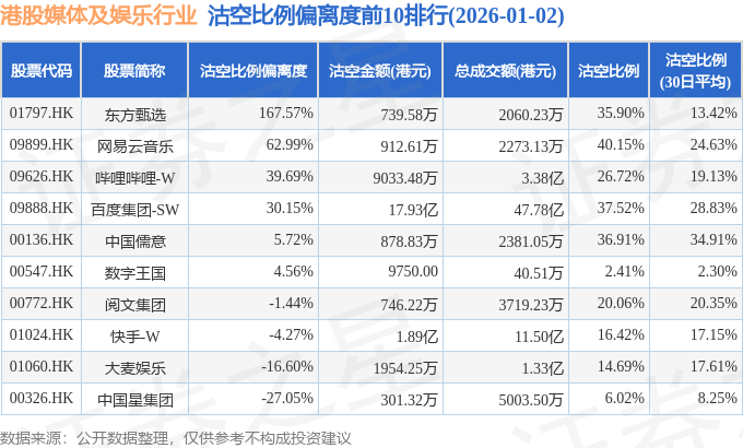 从沽空比例偏离度来看,东方甄选、网易云音乐、哔哩哔哩-W沽空比例偏离度位居行业前三,分别为167.57%、62.99%、39.69%。