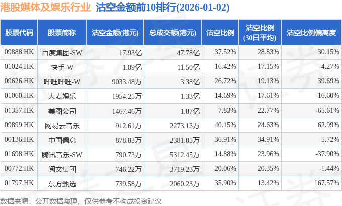 从沽空比例来看,网易云音乐、百度集团-SW、中国儒意沽空比例位居行业前三,分别为40.15%、37.52%、36.91%。