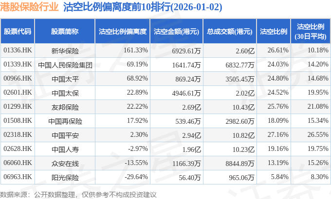 从沽空比例偏离度来看,新华保险、中国人民保险集团、中国太平沽空比例偏离度位居行业前三,分别为161.33%、69.19%、68.92%。