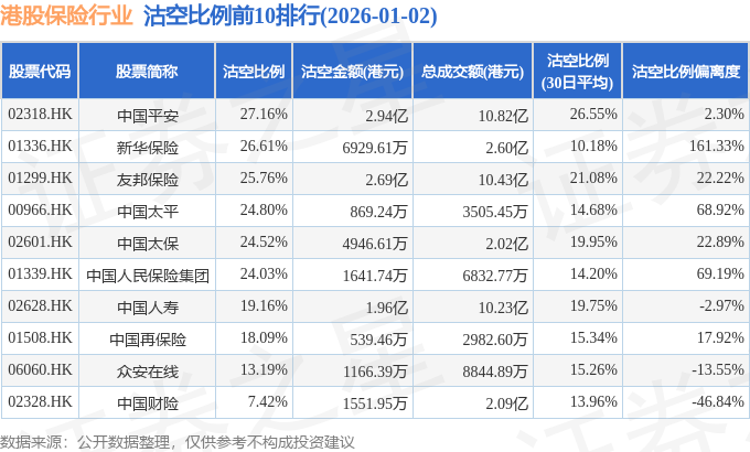 从沽空金额来看,中国平安、友邦保险、中国人寿沽空金额位居行业前三,分别为2.94亿港元、2.69亿港元、1.96亿港元。