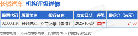 投行对该股的评级以增持为主,近90天内共有1家投行给出增持评级,近90天的目标均价为24港元。招商证券(香港)最新一份研报给予长城汽车增持评级,目标价24港元。