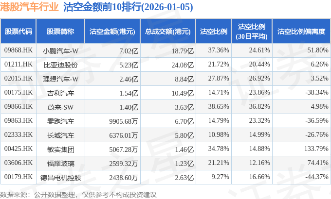 从沽空金额来看,小鹏汽车-W、比亚迪股份、理想汽车-W沽空金额位居行业前三,分别为7.02亿港元、5.23亿港元、2.46亿港元。