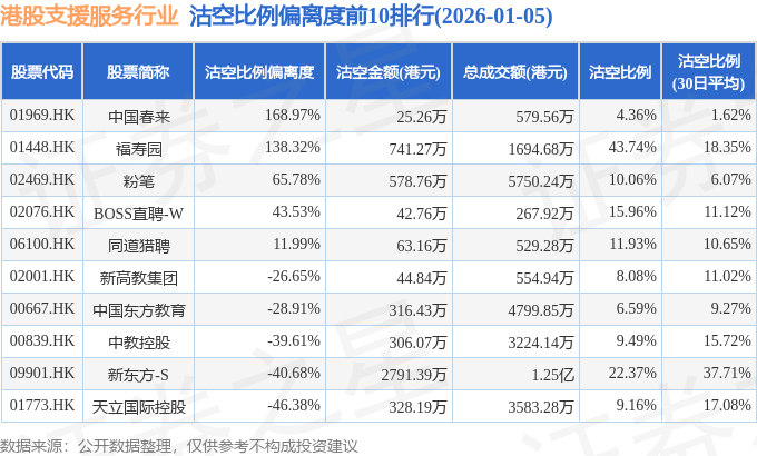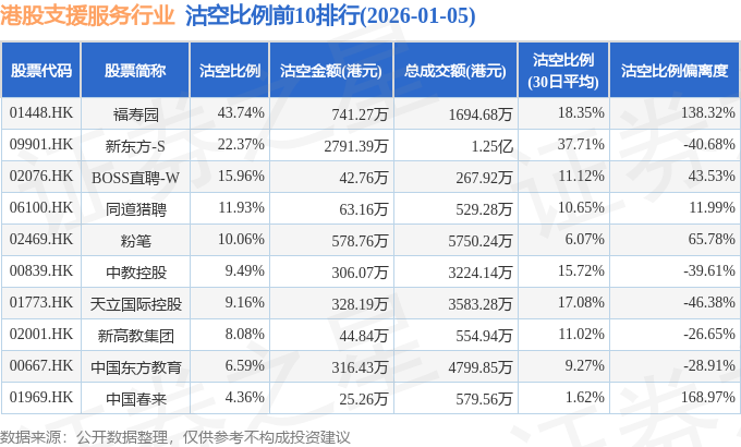 从沽空比例来看,福寿园、新东方-S、BOSS直聘-W沽空比例位居行业前三,分别为43.74%、22.37%、15.96%。