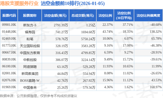 从沽空金额来看,新东方-S、福寿园、粉笔沽空金额位居行业前三,分别为2791.39万港元、741.27万港元、578.76万港元。