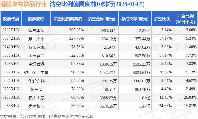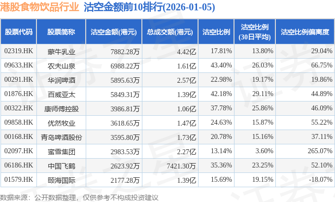 从沽空比例来看,农夫山泉、百威亚太、康师傅控股沽空比例位居行业前三,分别为43.4%、42.18%、37.78%。