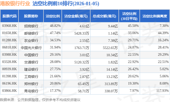 从沽空金额来看,招商银行、建设银行、中国银行沽空金额位居行业前三,分别为4.61亿港元、3.92亿港元、3.01亿港元。