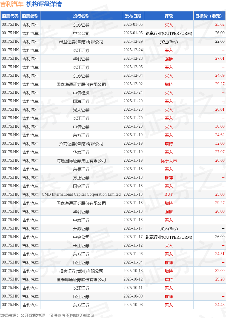 投行对该股的评级以买入为主,近90天内共有18家投行给出买入评级,近90天的目标均价为26.74港元。东方证券最新一份研报给予吉利汽车买入评级,目标价23.02港元。