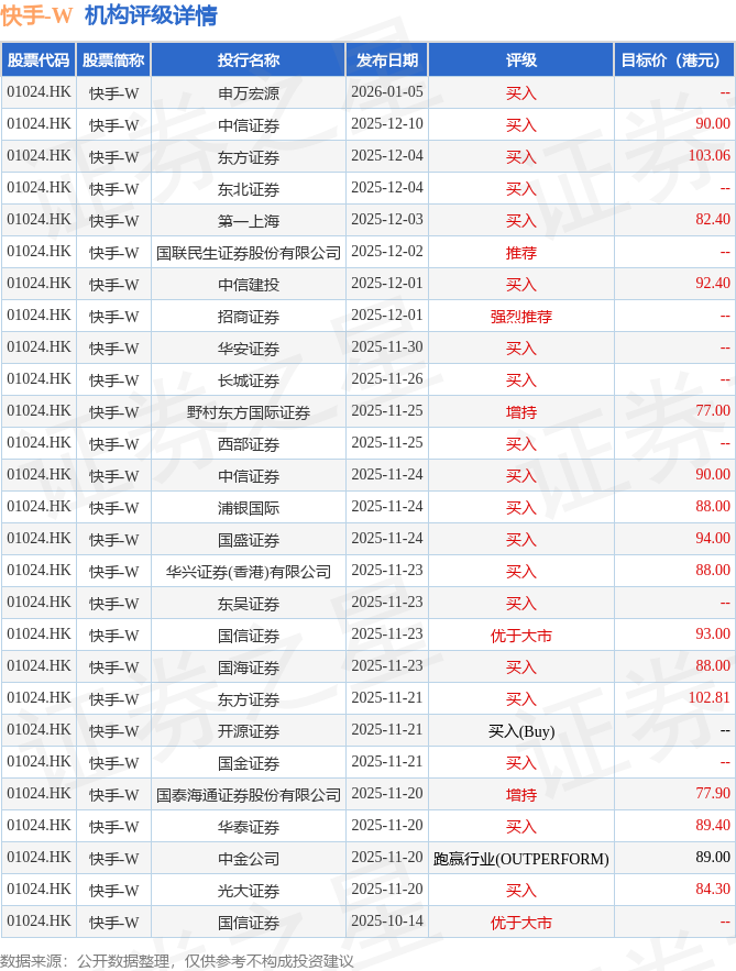 投行对该股的评级以买入为主,近90天内共有19家投行给出买入评级,近90天的目标均价为89.33港元。申万宏源最新一份研报给予快手-W买入评级。