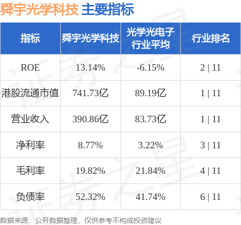 舜宇光学科技港股市值741.73亿港元,在光学光电子行业中排名第1。主要指标见下表: