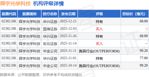 截至2026年1月6日收盘,舜宇光学科技(02382.HK)报收于67.1港元,下跌0.96%,成交量1642.33万股,成交额10.99亿港元。投行对该股的评级以持有为主,近90天内共有3家投行给出持有评级,近90天的目标均价为82.28港元。华兴证券最新一份研报给予舜宇光学科技持有评级,目标价68港元。