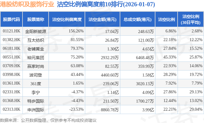 从沽空比例偏离度来看,金阳新能源、互太纺织、老铺黄金沽空比例偏离度位居行业前三,分别为156.26%、81.55%、79.37%。