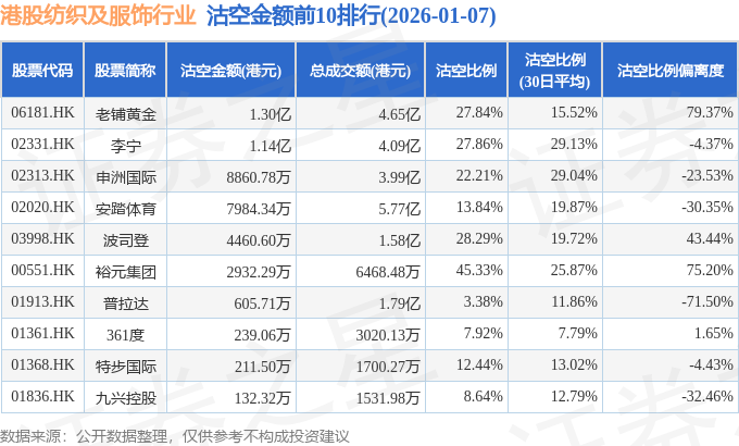 从沽空金额来看,老铺黄金、李宁、申洲国际沽空金额位居行业前三,分别为1.3亿港元、1.14亿港元、8860.78万港元。