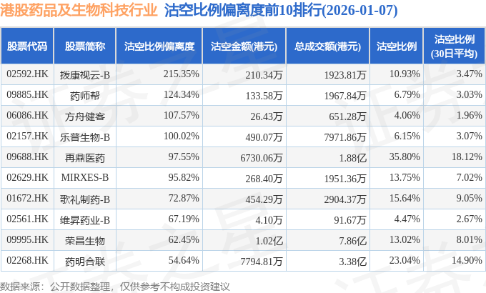 从沽空比例偏离度来看,拨康视云-B、药师帮、方舟健客沽空比例偏离度位居行业前三,分别为215.35%、124.34%、107.57%。