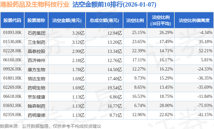 从沽空金额来看,石药集团、三生制药、晶泰控股沽空金额位居行业前三,分别为3.26亿港元、3.12亿港元、2.99亿港元。