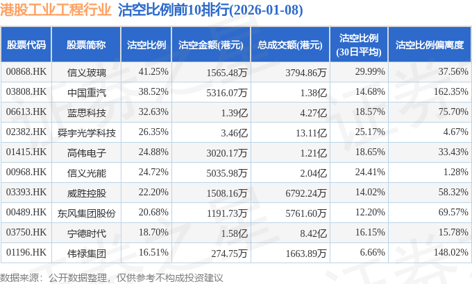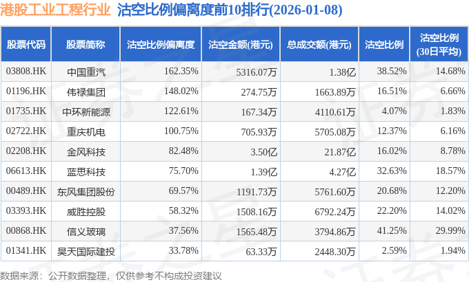 从沽空比例偏离度来看,中国重汽、伟禄集团、中环新能源沽空比例偏离度位居行业前三,分别为162.35%、148.02%、122.61%。