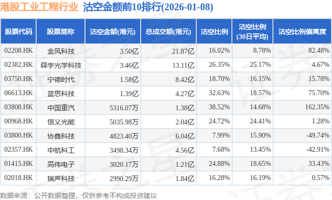 证券之星消息,1月8日港交所披露数据显示,当日港股工业工程行业的215只个股中有56只被沽空,总沽空股数为1.36亿股,总沽空金额为14.6亿元(港元),而当日工业工程行业的总成交金额为110.57亿元(港元),沽空比例为13.21%。当日工业工程行业总体跌0.59%。