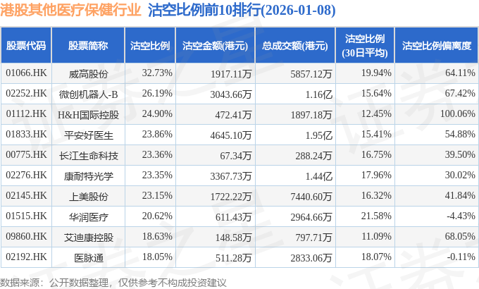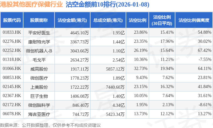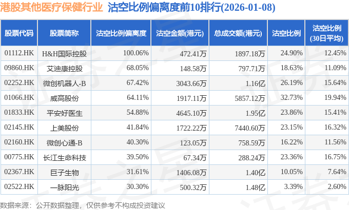 从沽空比例偏离度来看,H&H国际控股、艾迪康控股、微创机器人-B沽空比例偏离度位居行业前三,分别为100.06%、68.05%、67.42%。