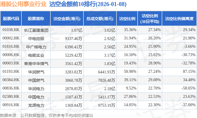 从沽空金额来看,长江基建集团、中电控股、中广核电力沽空金额位居行业前三,分别为1.07亿港元、9337.46万港元、6390.41万港元。
