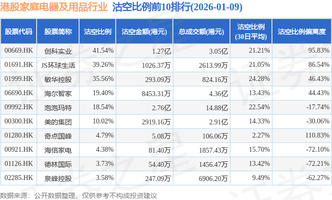 从沽空比例来看,创科实业、JS环球生活、敏华控股沽空比例位居行业前三,分别为41.54%、39.26%、35.56%。