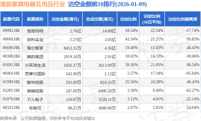 从沽空金额来看,泡泡玛特、创科实业、海尔智家沽空金额位居行业前三,分别为2.76亿港元、1.27亿港元、8453.31万港元。